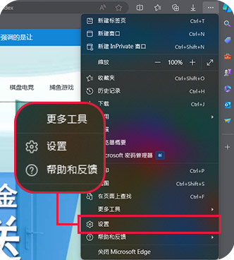 1. 打开Edge游览器,在最上方选择[三颗点]图标, 然后选取[设定]。